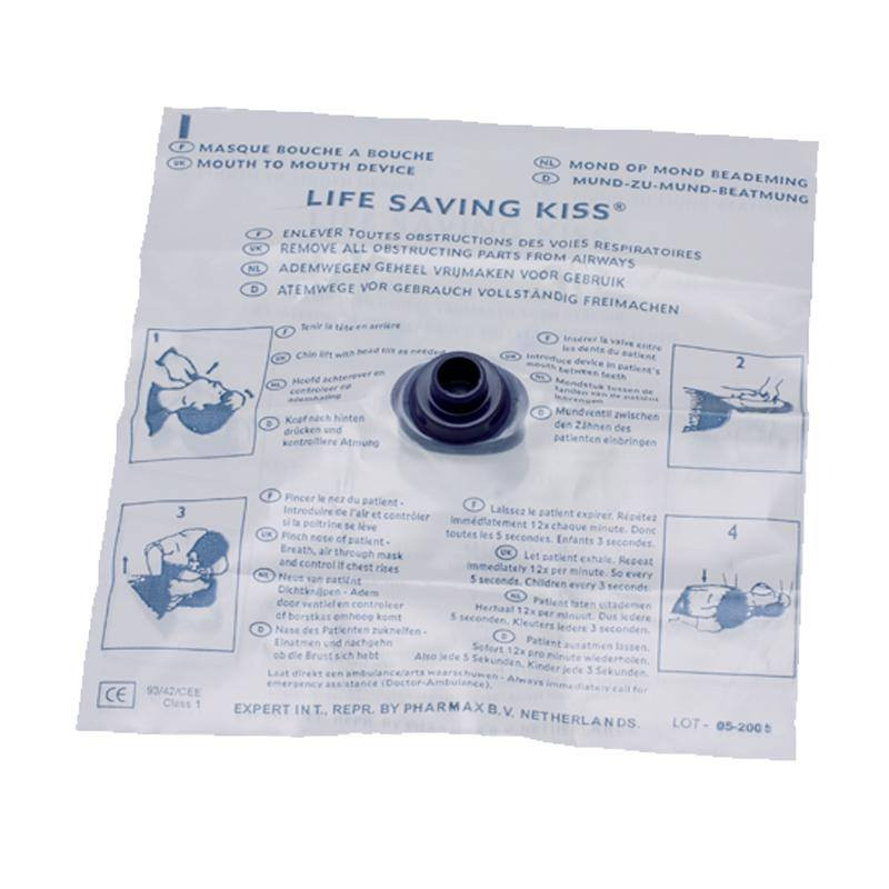 Beademingsdoekjes, met mondstuk en reanimatie instructies. De kiss of life wordt gebruikt bij mond op mond beademing. Het inblaasventiel heeft een terugslagklepje, dit zorgt ervoor dat ingeblazen lucht wordt doorgelaten maar lucht uit het slachtoffer niet door het ventiel kan terugstromen. Verpakt in gripzakje, handig om te bewaren in de EHBO koffer of safe set van de AED.